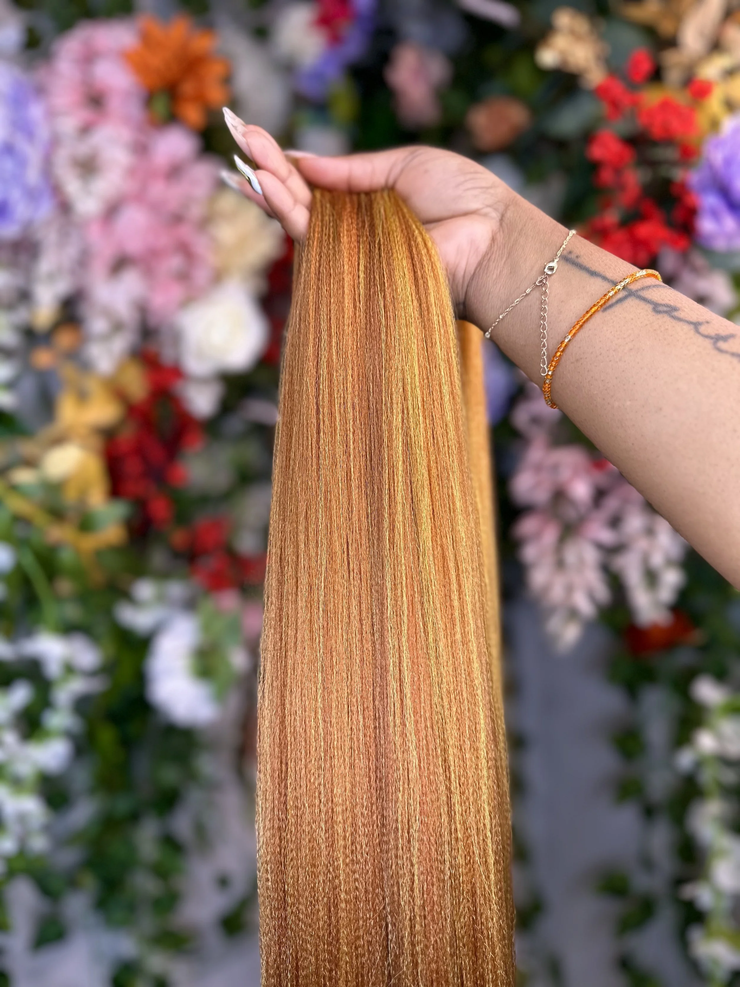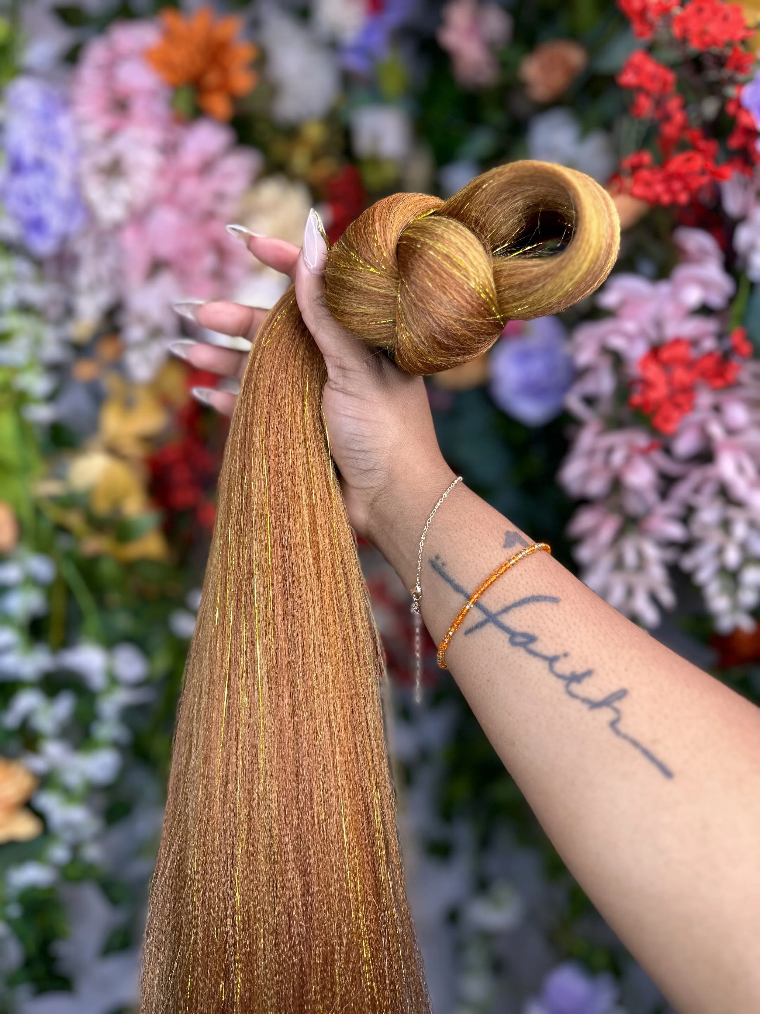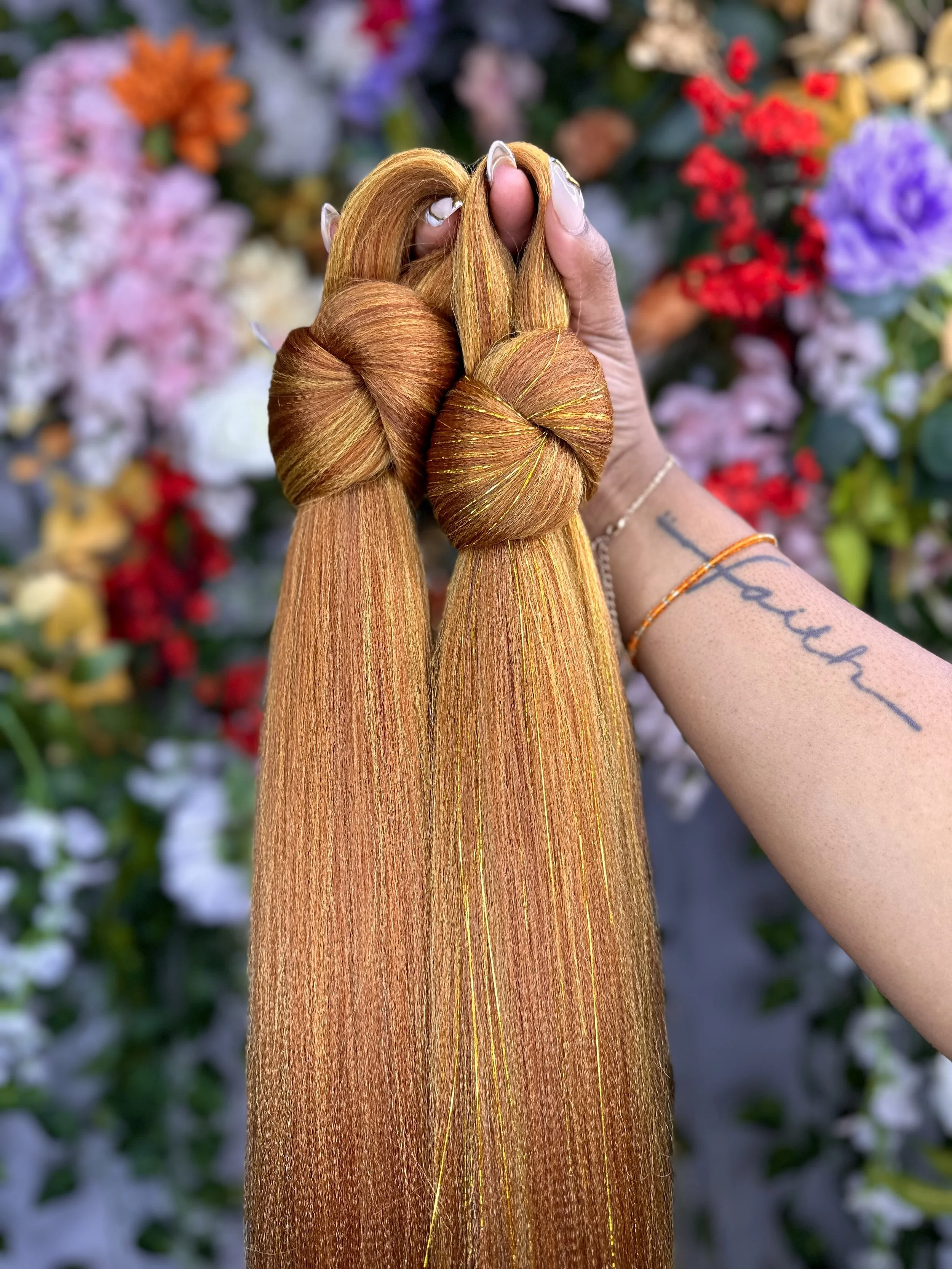 Maple Honey is a glowing blend of ginger, copper, blonde, and chestnut braiding hair that captures the sweetness of fall afternoons. With warm golden tones that feel like sunlight, this custom mix adds highlights and depth to every braid, perfect for knotless, boho, or twists. This limited edition blend is available only until December 2.