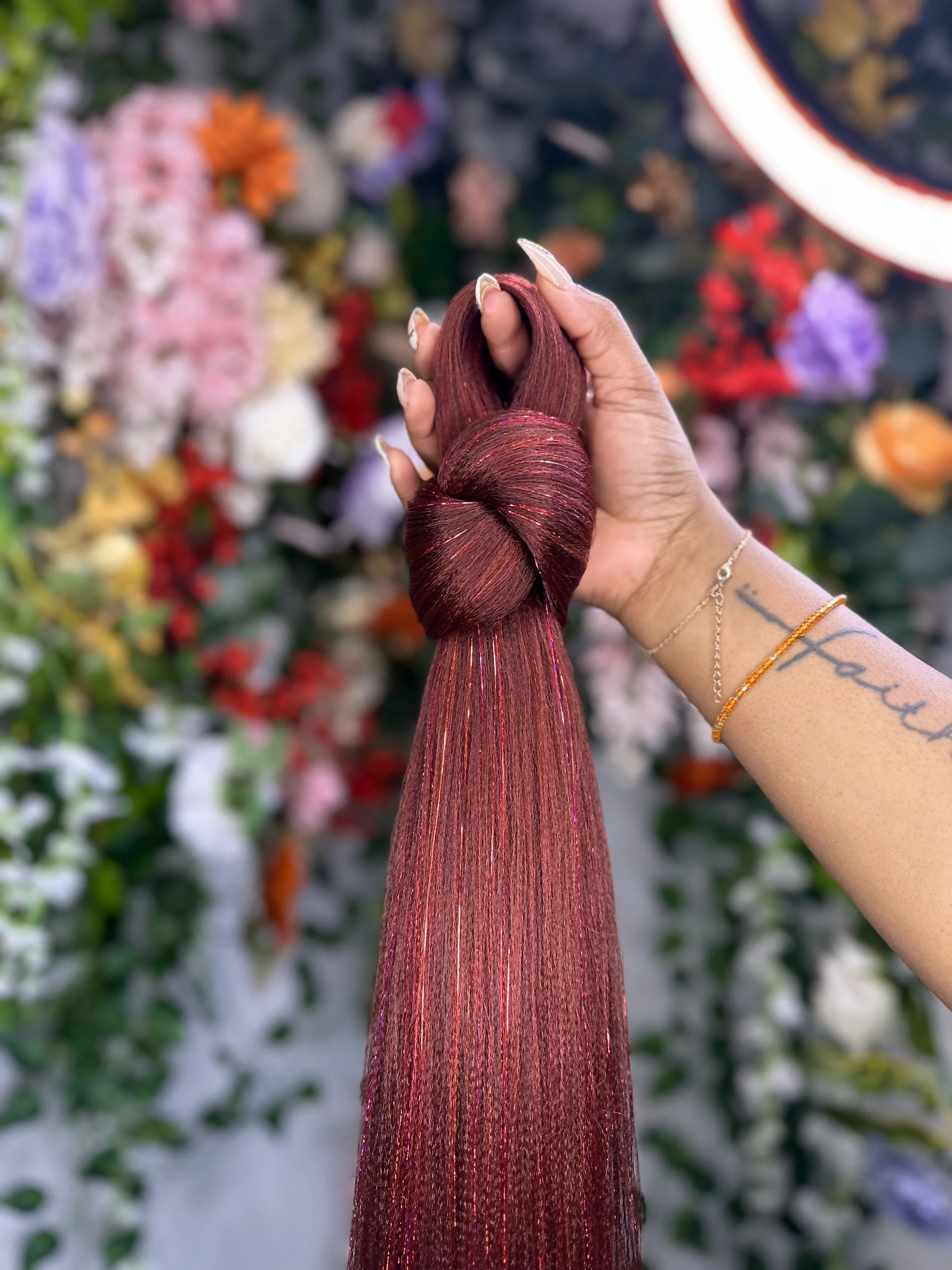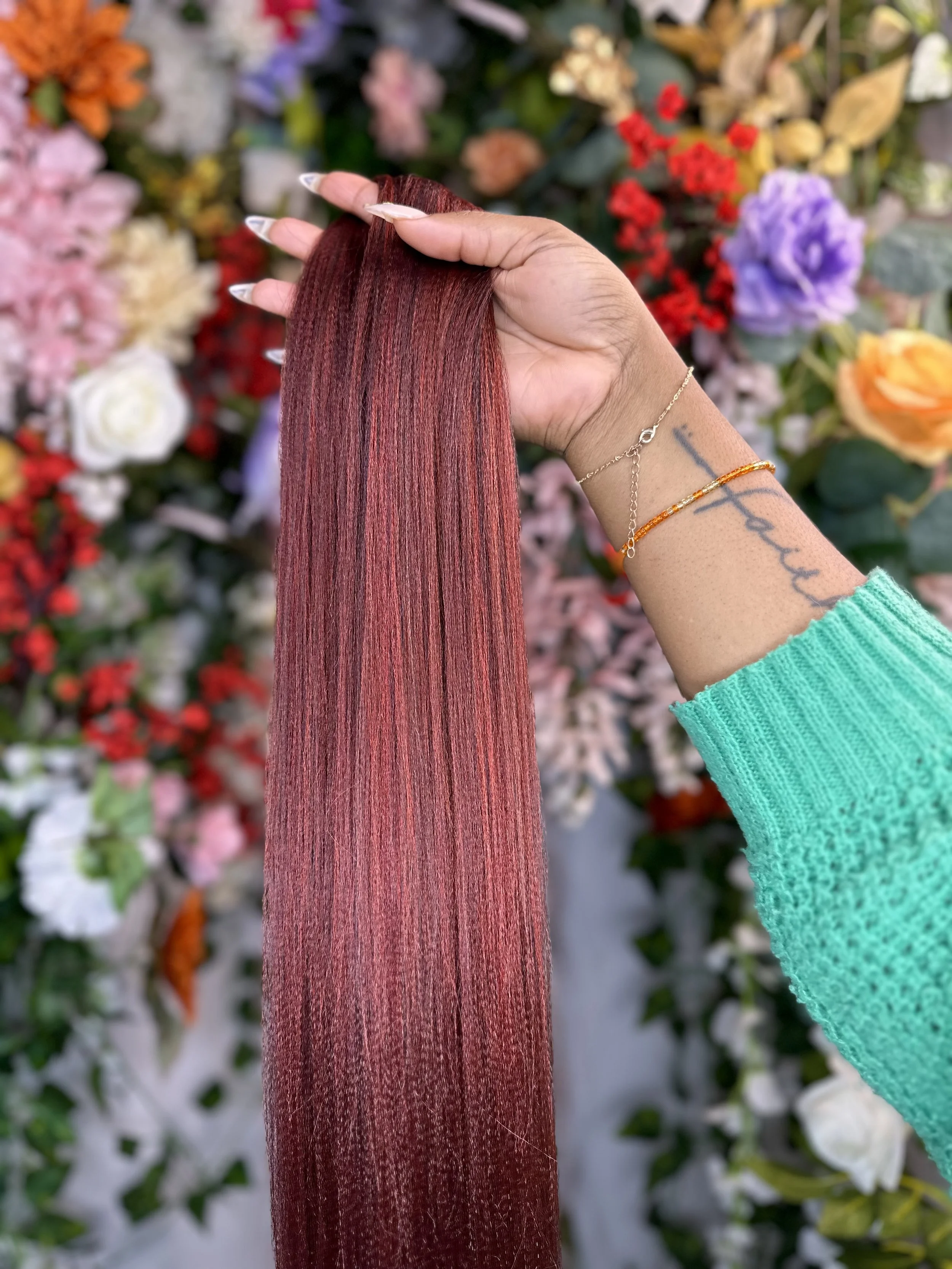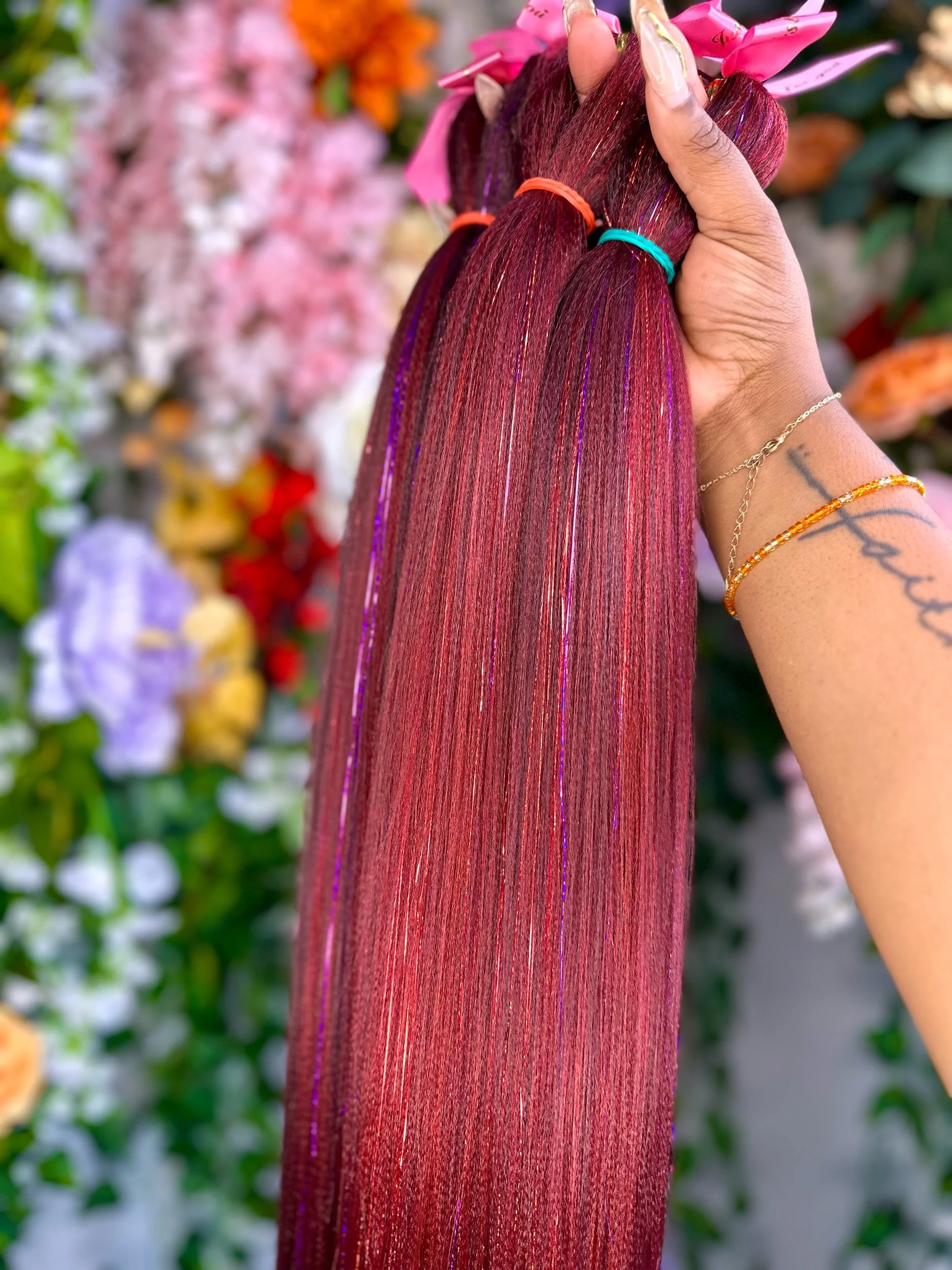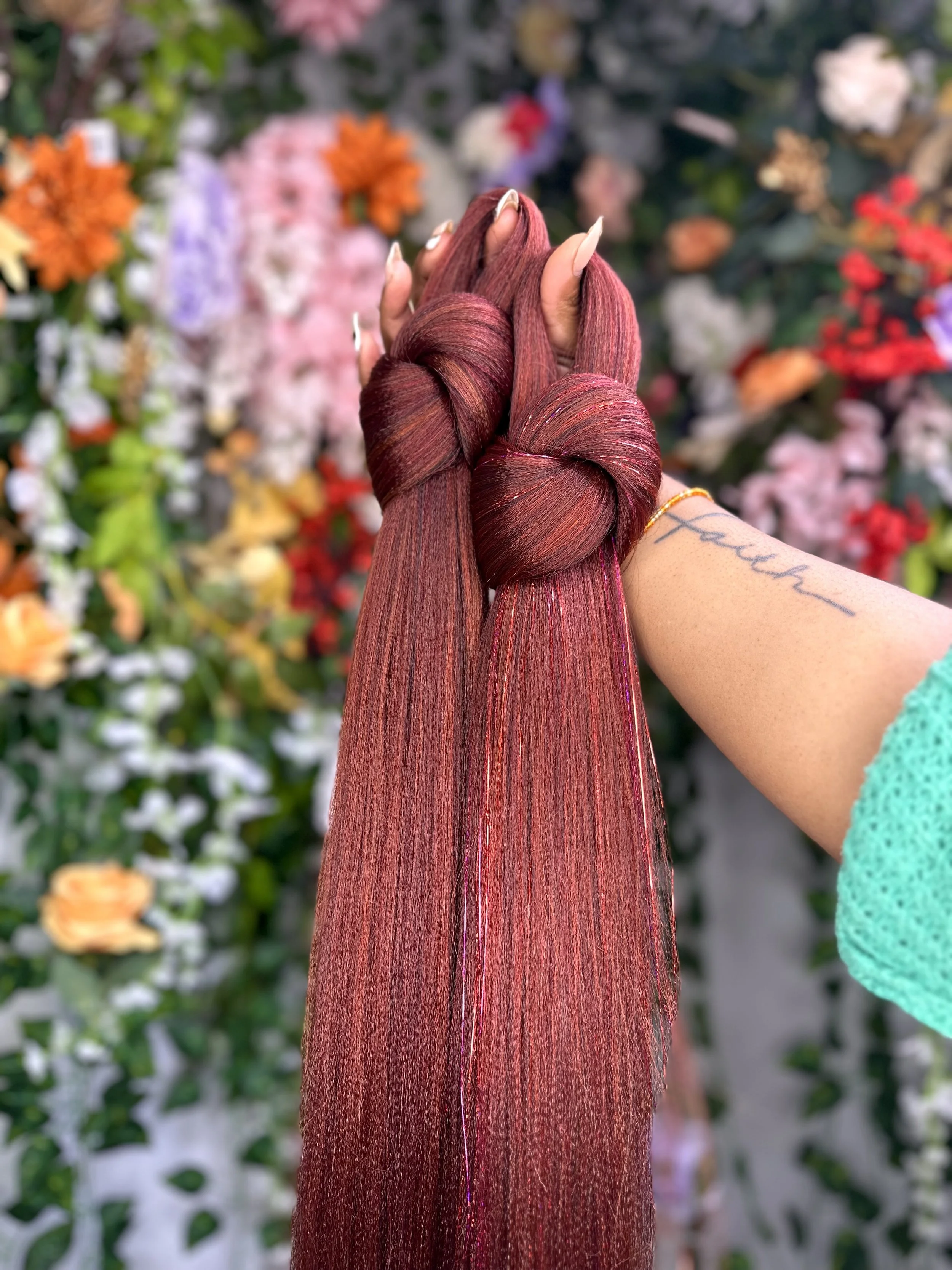 Raspberry Cabernet is a rich blend of deep reds braiding hair with a hint of ginger for brightness. Bold yet inviting, this custom mix brings warmth and vibrancy to braids, twists, and boho styles—like wrapping yourself in fall’s cozy essence with a glass of wine. This limited edition blend is available only until December 2.